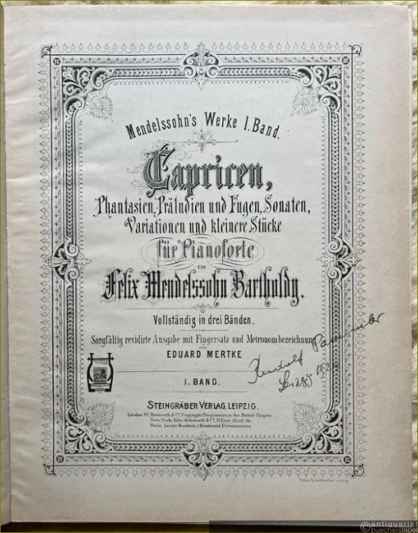 Capricen, Phantasien, Präludien und Fugen, Sonaten, Variationen und kleinere Stücke für Pianoforte von Felix Mendelssohn Bartholdy (= Mendelssohn's Werke, I - III. Band. Sorgfältig revidirte Ausgabe mit Fingersatz und Metronombezeichnung von Eduard Mertke).