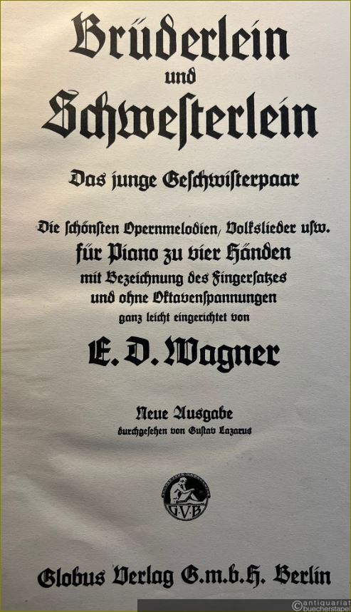 Brüderlein und Schwesterlein. Das junge Geschwisterpaar. Die schönsten Opernmelodien, Volkslieder usw. für Piano zu vier Händen mit Bezeichnung des Fingersatzes und ohne Oktavenspannungen ganz leicht eingerichtet von E. D. Wagner.