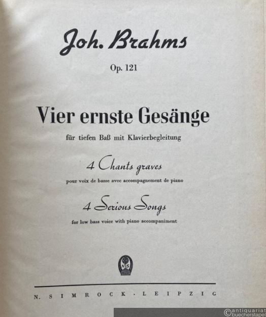 Vier ernste Gesänge für tiefen Baß mit Klavierbegleitung, op. 121 / 4 chants graves pour voix de basse avec accompagnement de piano / 4 serious songs for low bass voice with piano accompaniment. - Ausgewählte Lieder und Gesänge I (= Edition Breitkopf, Nr. 5291c). Tief [2 Hefte in 1 Band].